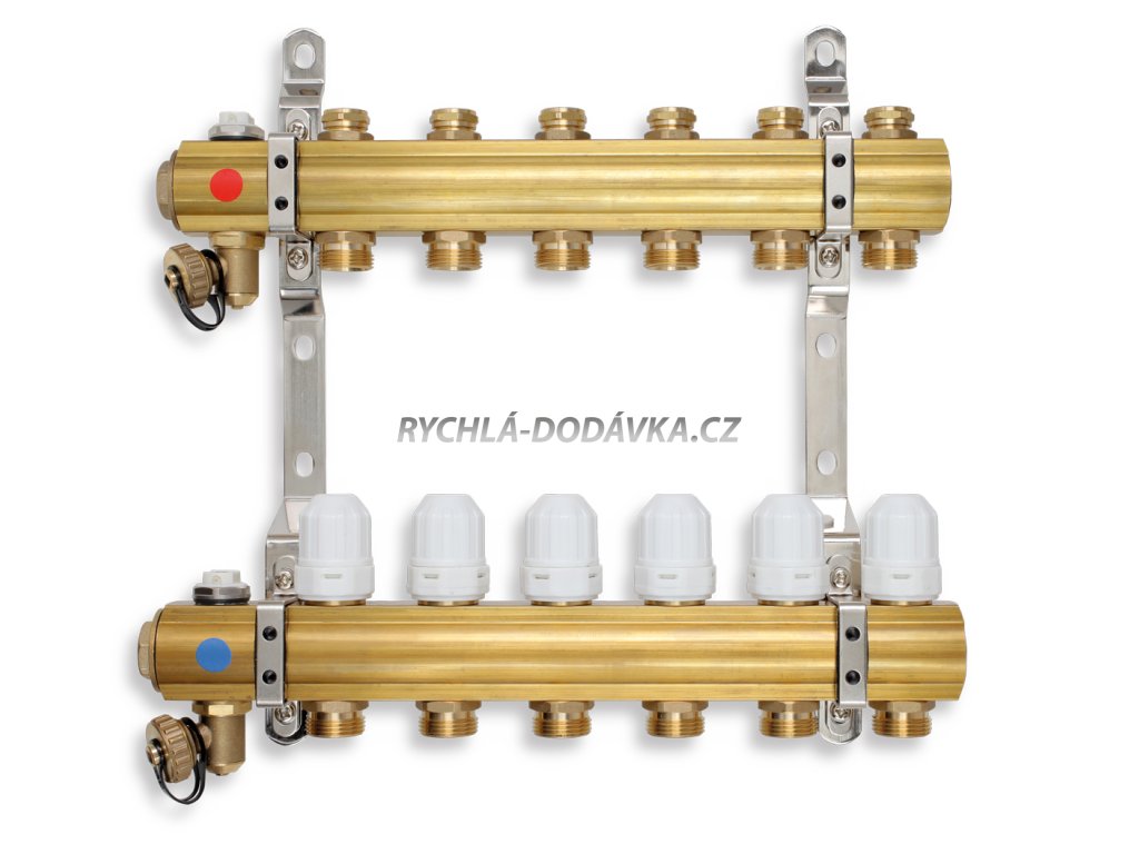 Rozdělovač s regulačními a uzavíracími ventily pro podlahové vytápění, připojení G1", výstup pro svěrné šroubení G3/4" s eurokonusem.Rozdělovač je možné doplnit čerpadlovou sestavou GM40GPA a kulovými kohouty KFPS3.
