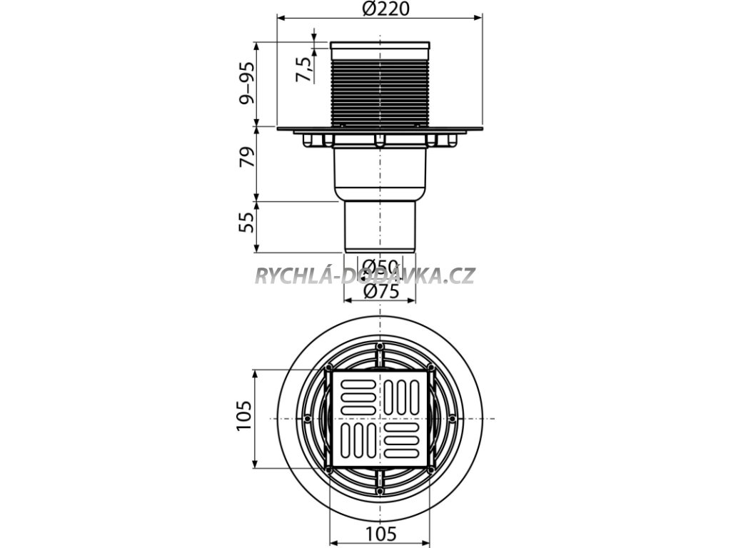 Alcadrain APV2311 - Podlahová vpust 105×105/50/75 mm přímá, mřížka nerez, vodní zápachová uzávěra + SLEVA 3% při použití kódu MS3 v košíku