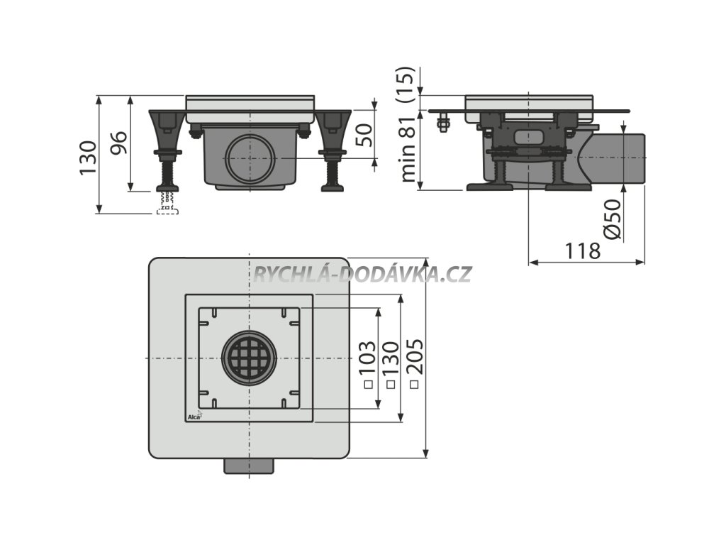 Alcadrain APV120 - Podlahová vpust nerezová nízká 130×130 mm boční, bez mřížky, Kombinovaná zápachová uzávěra SMART + SLEVA 3% při použití kódu MS3 v košíku