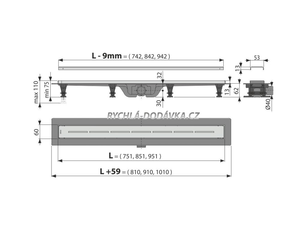 Alcadrain APZ18-750M - Podlahový žlab s nerezovým okrajem pro perforovaný rošt + SLEVA 3% při použití kódu MS3 v košíku