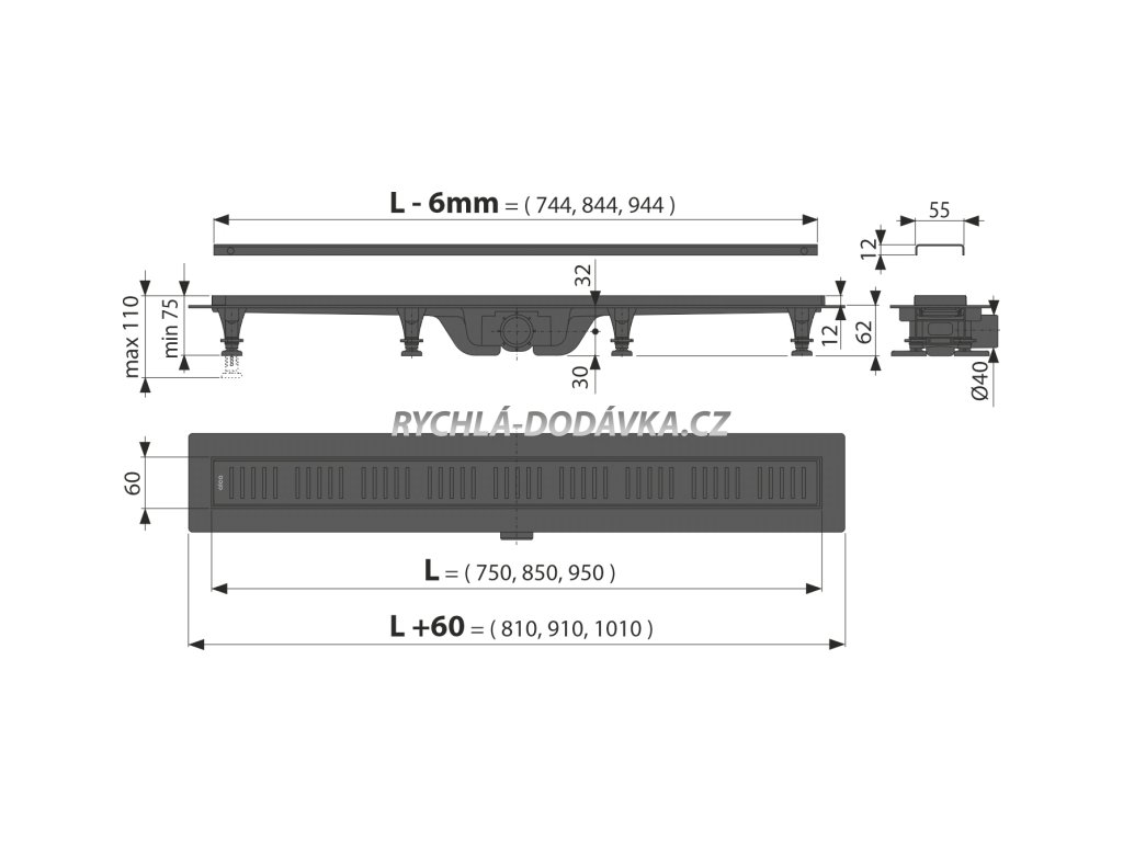 Alcadrain APZ10BLACK-850M - Podlahový žlab s okrajem pro perforovaný rošt, černá-mat + SLEVA 3% při použití kódu MS3 v košíku