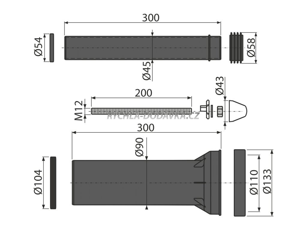 Fixační set pro uchycení WC mísy: závitová tyč M12 – 2 ks, podložky – 4 ks, krytka – 2 ks, matice – 2 ks, chránička závitu – 2 ks