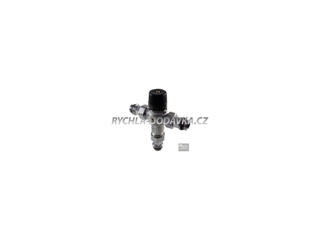 Termostatický směšovací ventil s výstupem dolů, nastavitelný knoflíkem v rozsahu 35-55°C. Kvs=0,9 m3/h, připojení G 1/2" M. Zajišťuje směšování studené vody s teplou vodou z ohřívače tak, aby voda na výstupu dosáhla předem nastavené požadované teploty. Při přerušení přívodu studené vody automaticky zavře přívod horké vody a zajistí tak ochranu proti opaření. Na vstupu studené a teplé vody je osazen šroubením se zpětným ventilem (ZV) pro zamezení zpětného proudění a sítkem pro ochranu proti nečistotám. Na výstupu smíšené vody je pouze šroubení.
