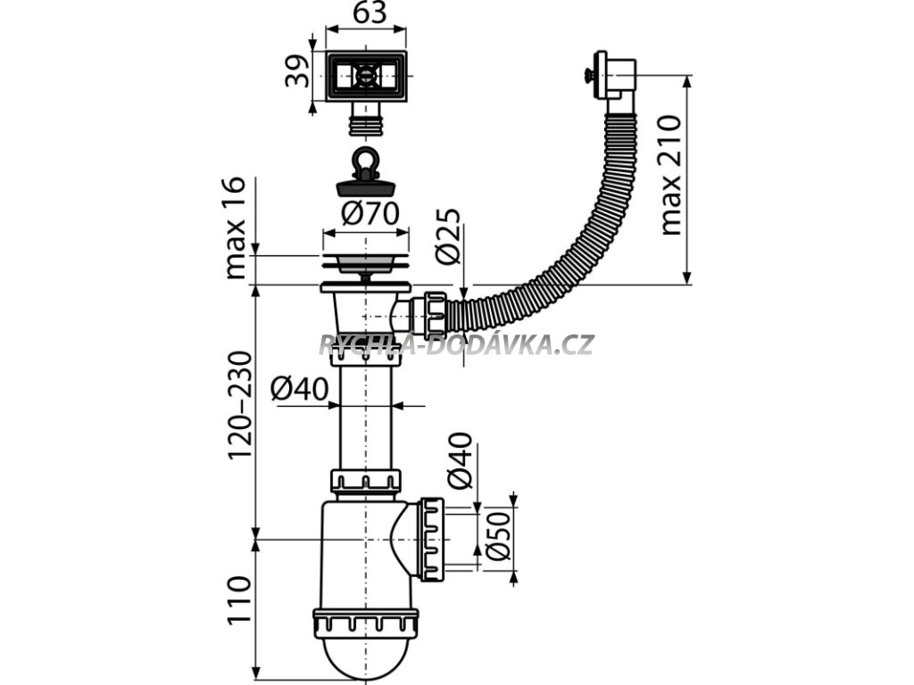 Alcadrain A444-DN50/40 - Sifon dřezový s nerezovou mřížkou DN70 a flexi přepadem + SLEVA 3% při použití kódu MS3 v košíku