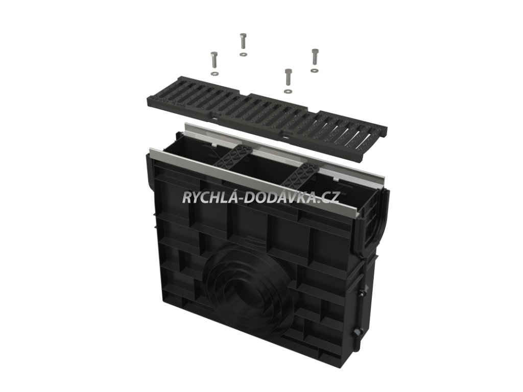 Rošt litinový – fixovaný ve žlabu pomocí čtyř kusů nerezových šroubů, šířka vtokové štěrbiny 11,6 mm